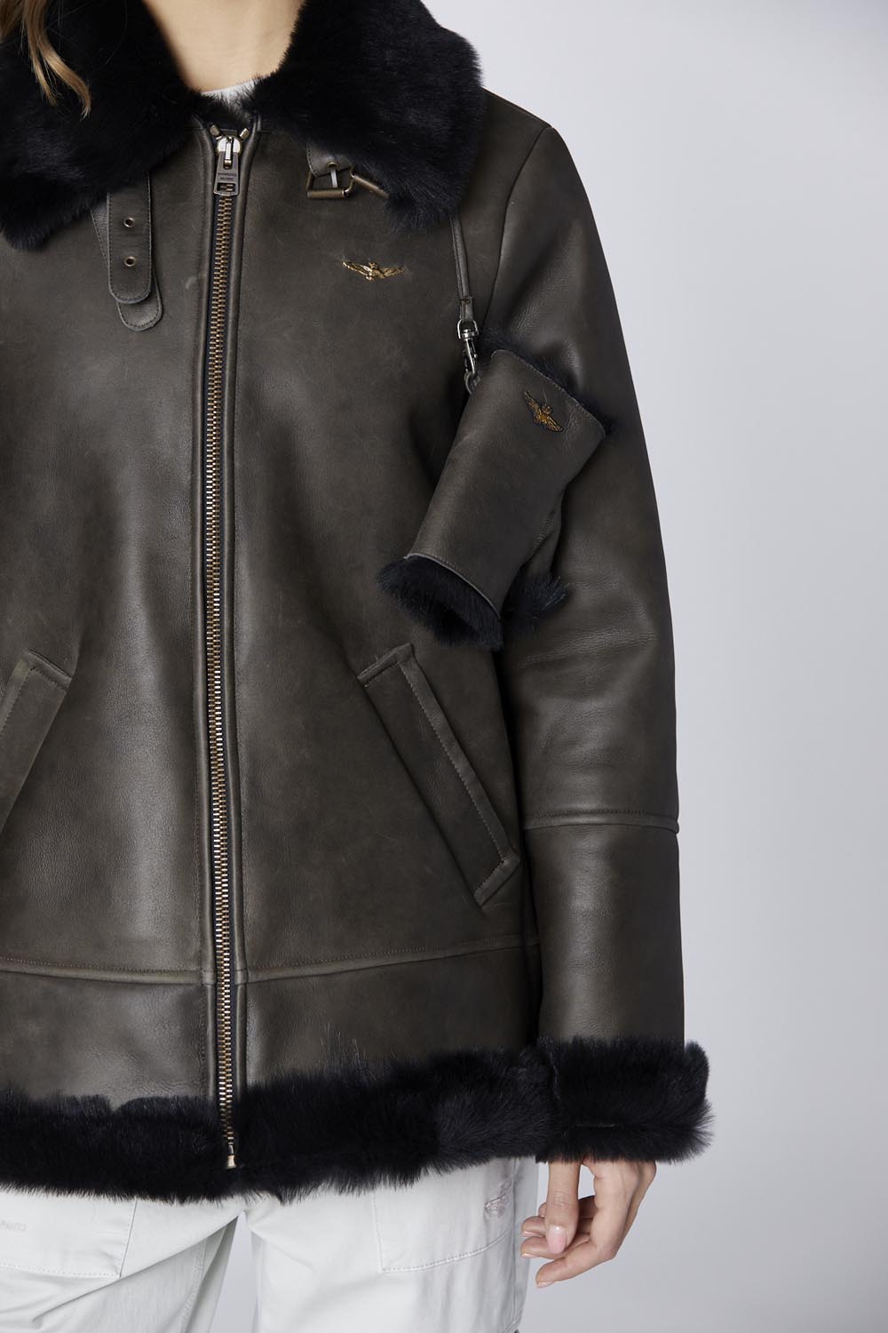 Tato dámská letecká kožená bunda z měkké střiže je ztělesněním elegance a praktičnosti. Je vyrobena z vysoce kvalitní ovčí kůže a ručně zhotovena v Itálii a nabízí výjimečnou měkkost a bezkonkurenční pohodlí. Design je obohacen kožešinovým límcem a manžetami, které dodávají oděvu nádech rafinovanosti a hřejivosti, takže je ideální pro chladnější dny. Soubor doplňují sladěné palčáky, které zajišťují harmonický styl.