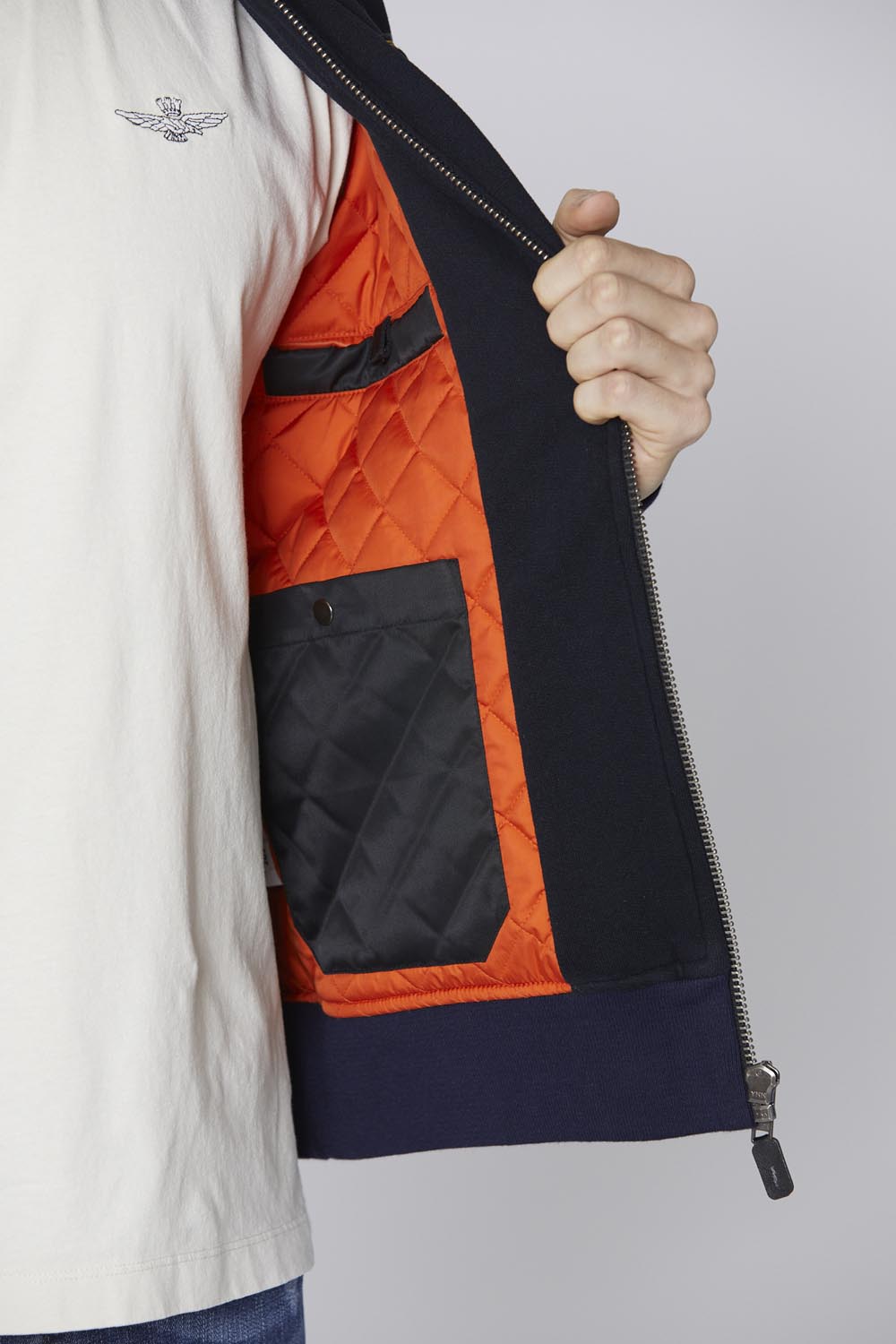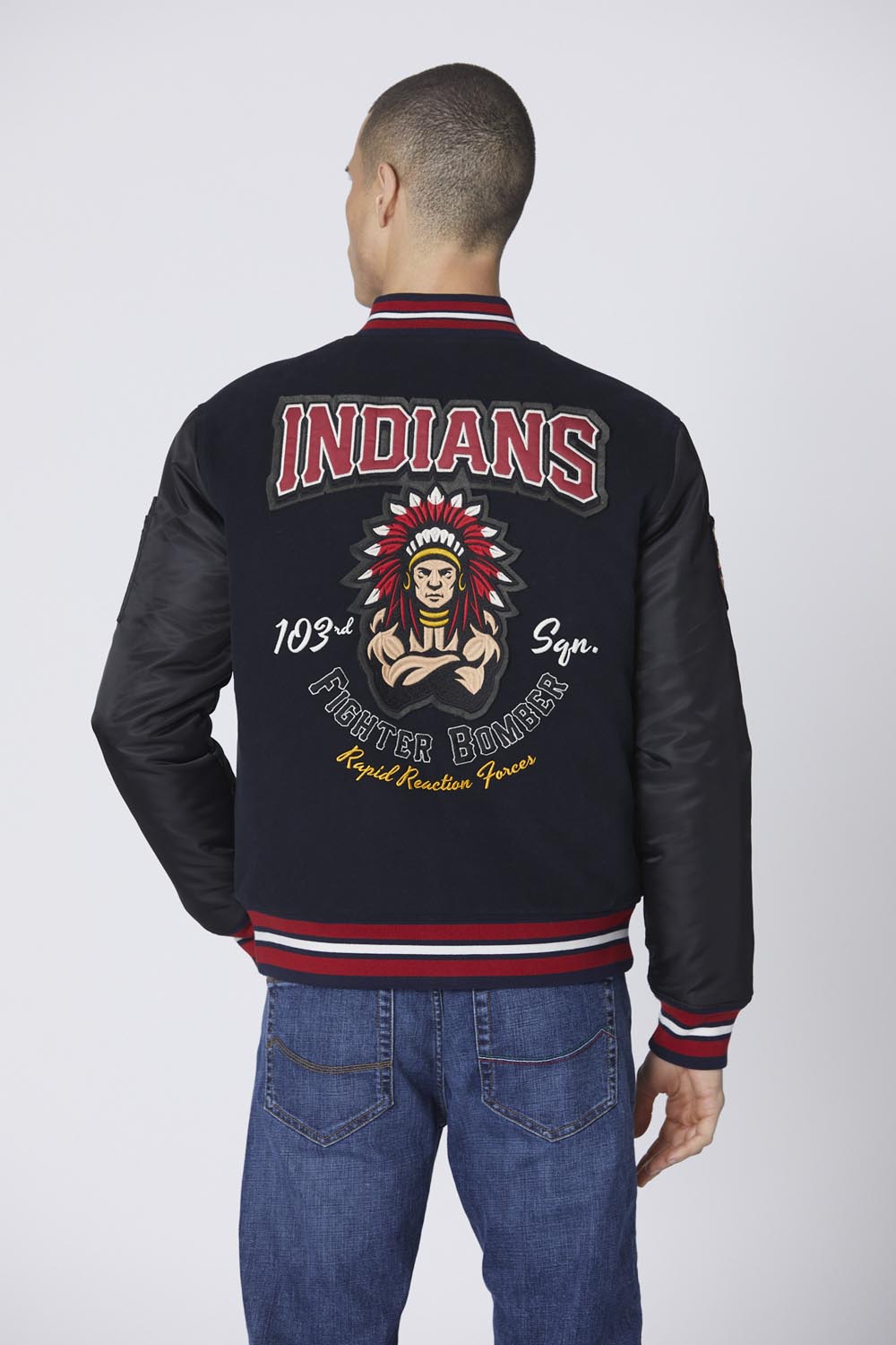 Polstrovaný bomber, který reinterpretuje bohatou grafickou tradici italského letectva ve fascinujícím vysokoškolském a moderním stylu. Propracované detaily a atraktivní design vystihují podstatu 103. letky, jejímž pilotům se přezdívá „indiáni“. Výrazné vyšívané nášivky a trojrozměrné plstěné aplikace oživují oděv vyrobený z důmyslné směsi bavlněného rouna a nylonu, doplněné barevnými žebrovanými detaily.