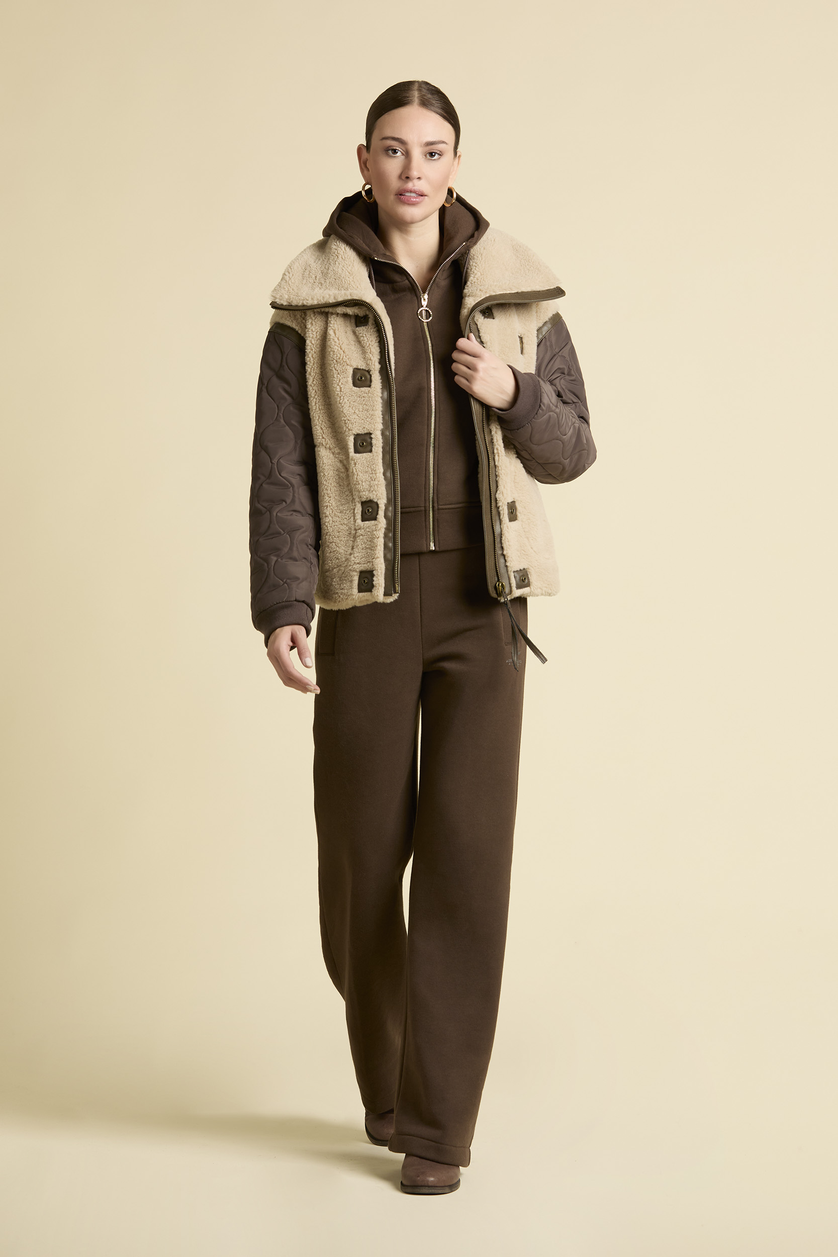 Tyto dámské kalhoty se širokými nohavicemi spojují každodenní pohodlí s moderním, čistým střihem. Vyrobeny z měkkého fleecu ze směsi bavlny, nabízejí příjemný pocit při nošení. Rovný střih prodlužuje postavu, zatímco elastický pas zajišťuje flexibilní a lichotivý tvar. Jemný tón v tónu potisk na levé straně dodává kalhotám minimalistický a rafinovaný detail.