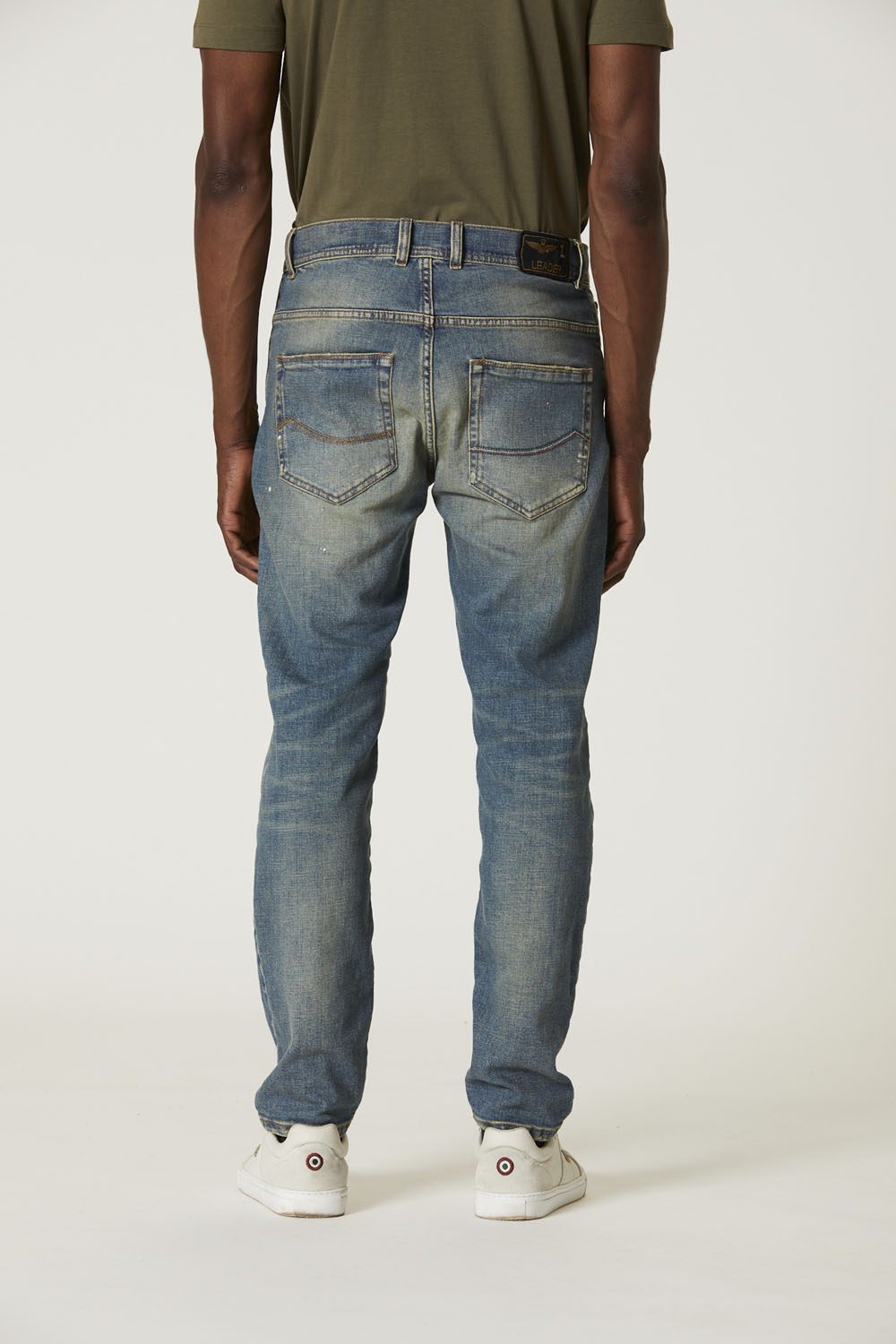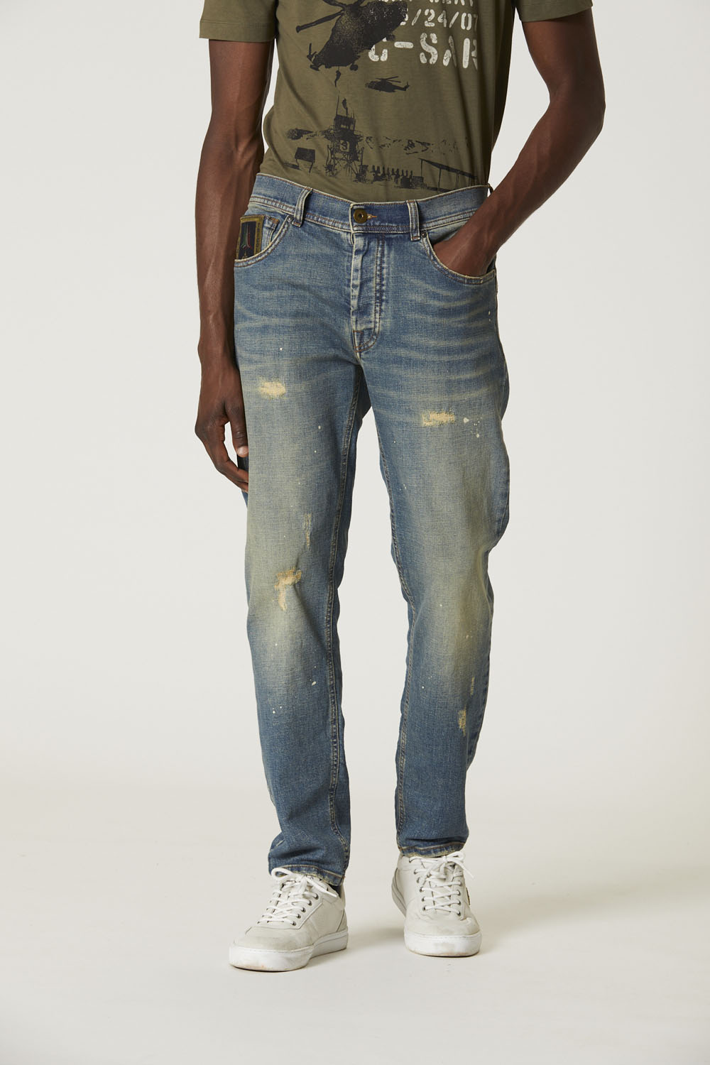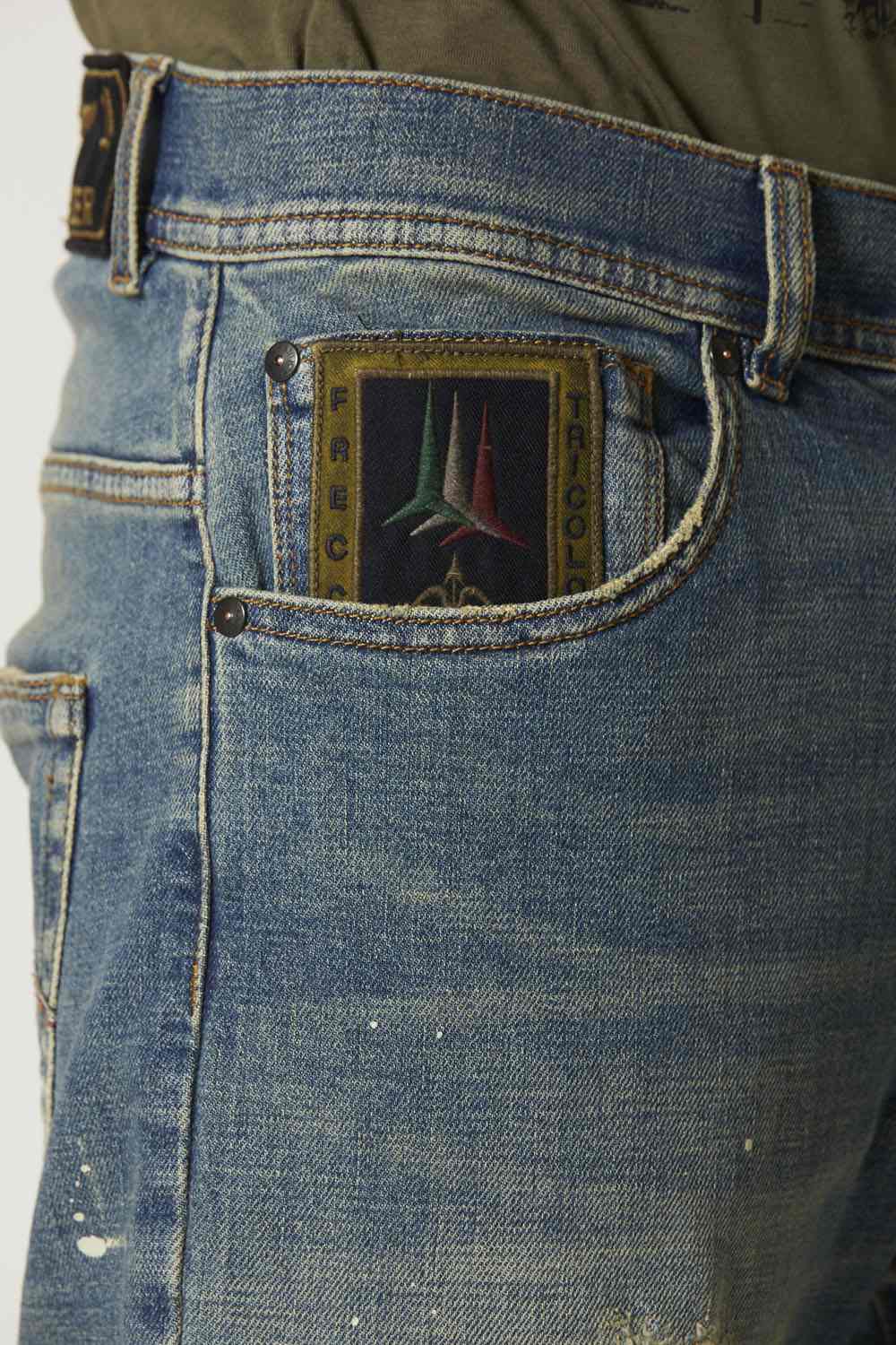 Tyto džíny, které jsou součástí kolekce kapslí Frecce Tricolori, jsou obohaceny o okouzlující nášivky připomínající archivní grafiku, kterou používá nejznámější světový akrobatický tým. Tento oděv vyrobený z předsráženého denimu, již vypraného, aby si časem držel svůj tvar, se vyznačuje jedinečnými praními se speciálními nástřiky, které mu dodávají vintage a zároveň originální vzhled.