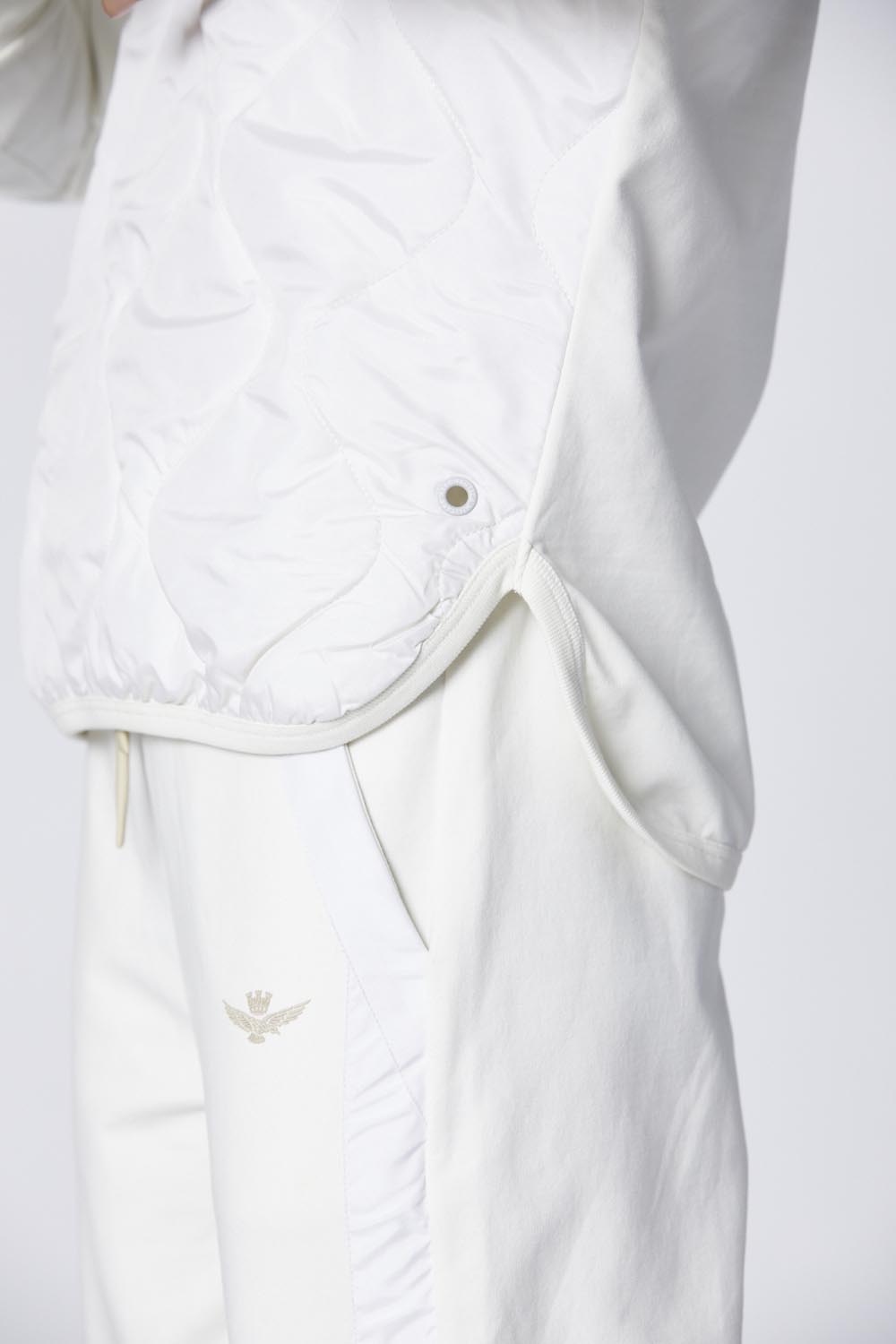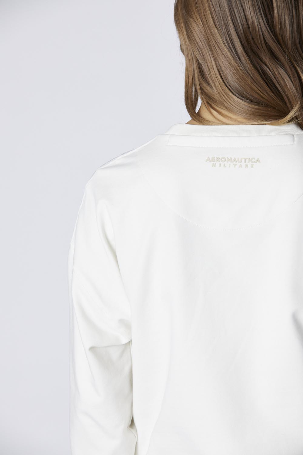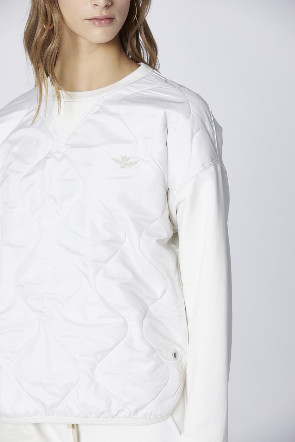 Dámská mikina s výstřihem z elastické broušené bavlny, obohacená o tonální prošívané nylonové kontrasty na přední straně. Volný střih nabízí ležérní eleganci, ideální pro ty, kdo hledají nadčasové pohodlí a styl s nádechem originality.