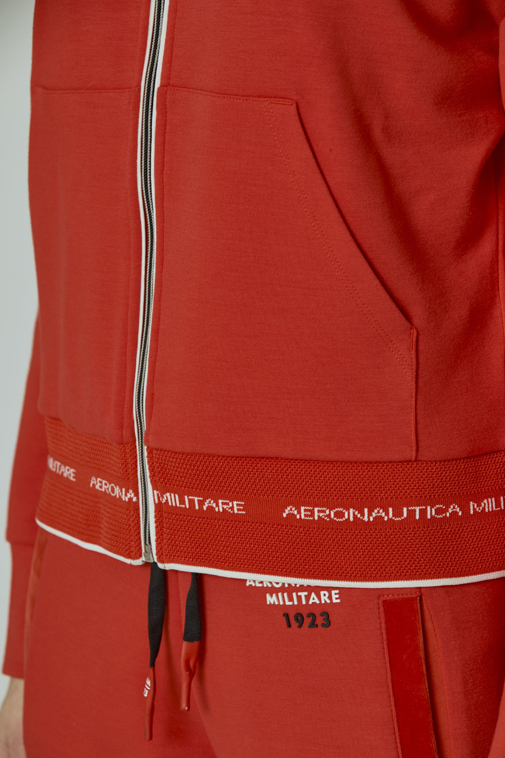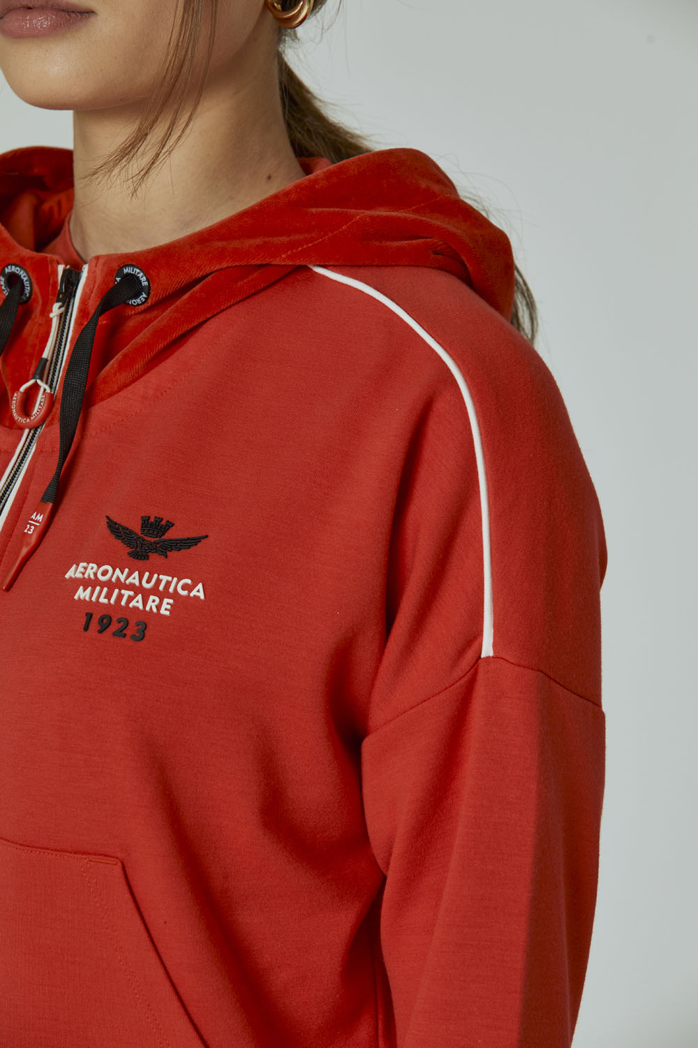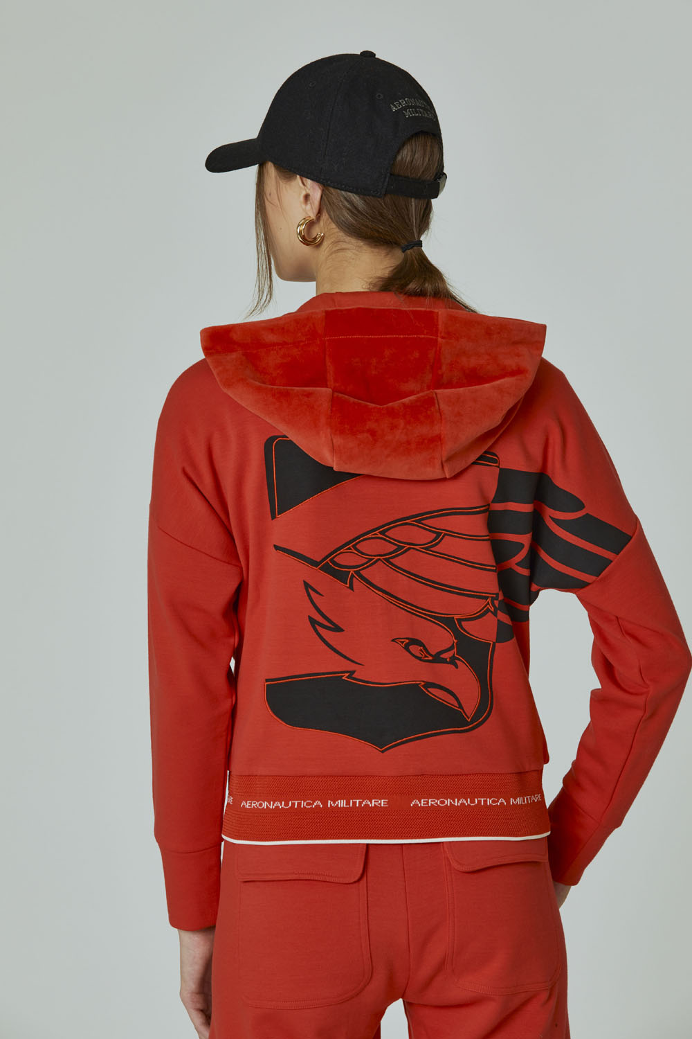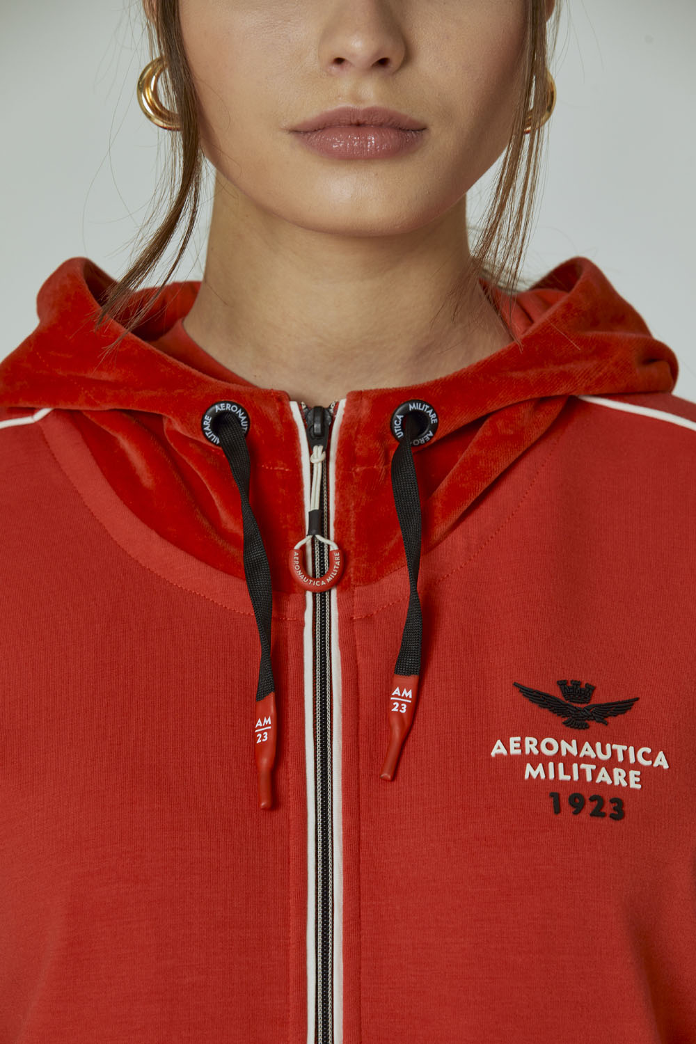 Mikina s gázou a kapucí, která ohromí množstvím detailů. Směs látek, majestátní grafiky a barevných kontrastů: to je silný styl Aeronautica Militare.