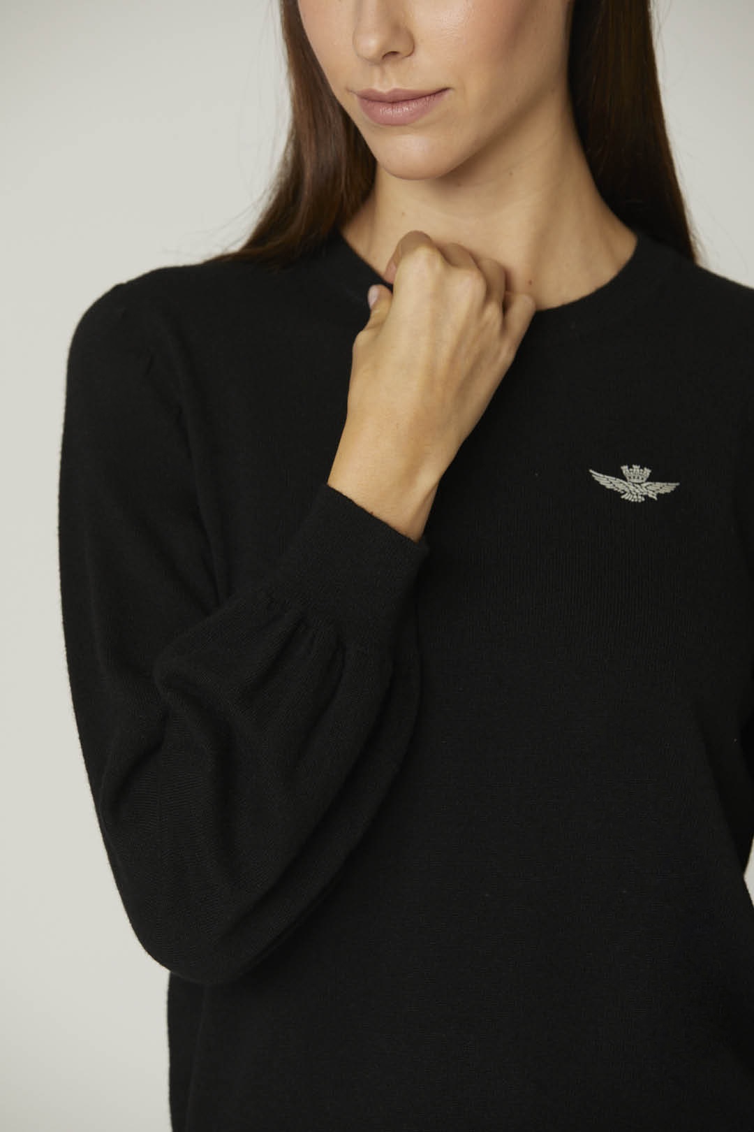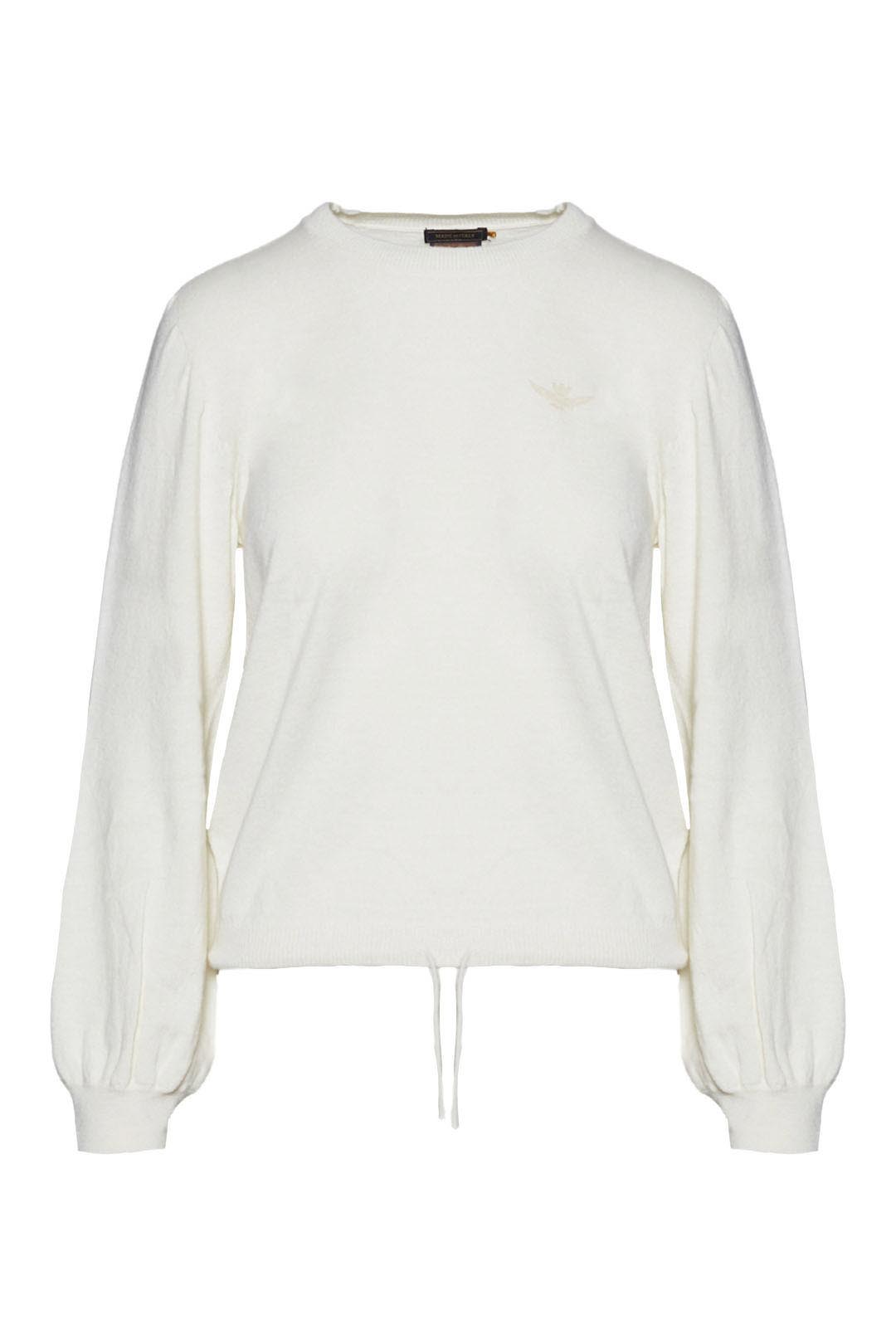 Tento svetr je dokonalým oděvem, který dodá vašemu oblečení ženský nádech. Je vyroben ze směsi měkkého a hřejivého kašmíru, má kulatý výstřih, praktickou nastavitelnou šňůrku ve spodní části a balonové rukávy pro příjemný objemový efekt. Stylové detaily doplňuje jemný flockový potisk s podpisem korunovaného orla.