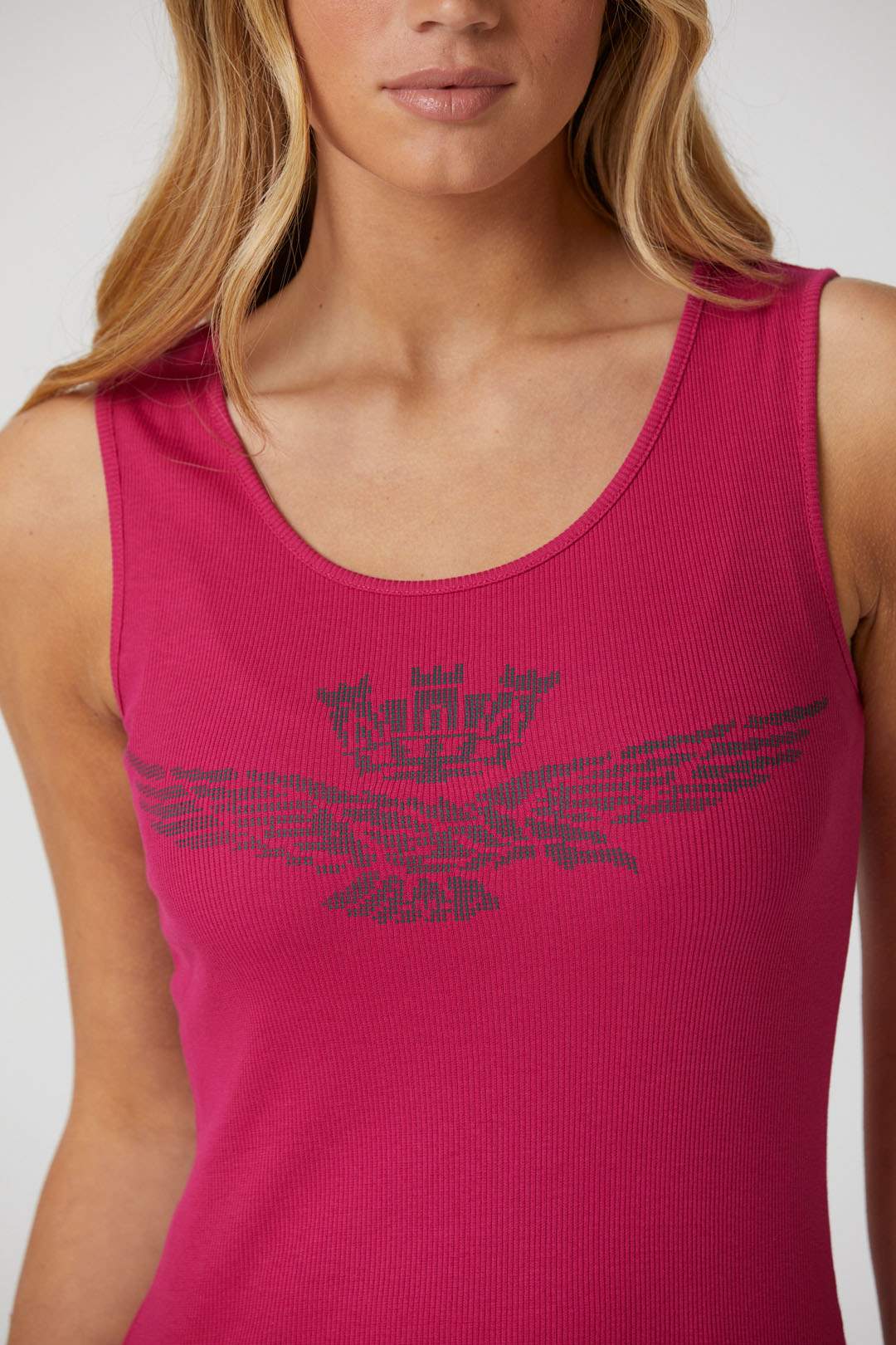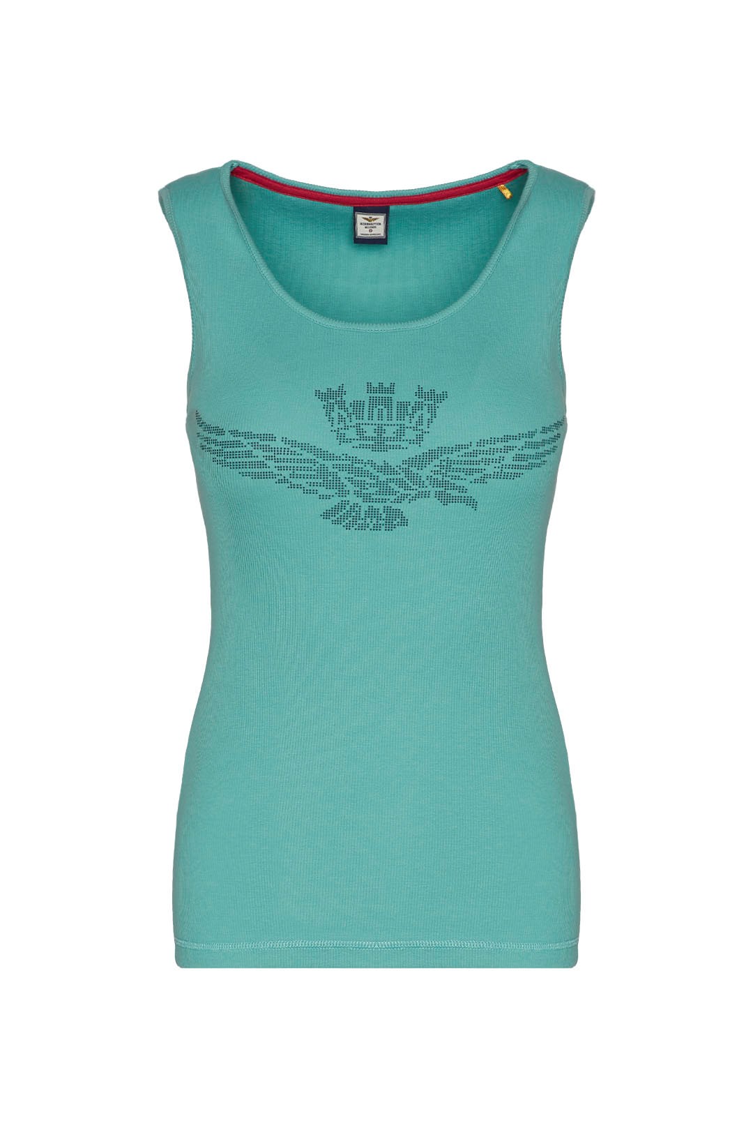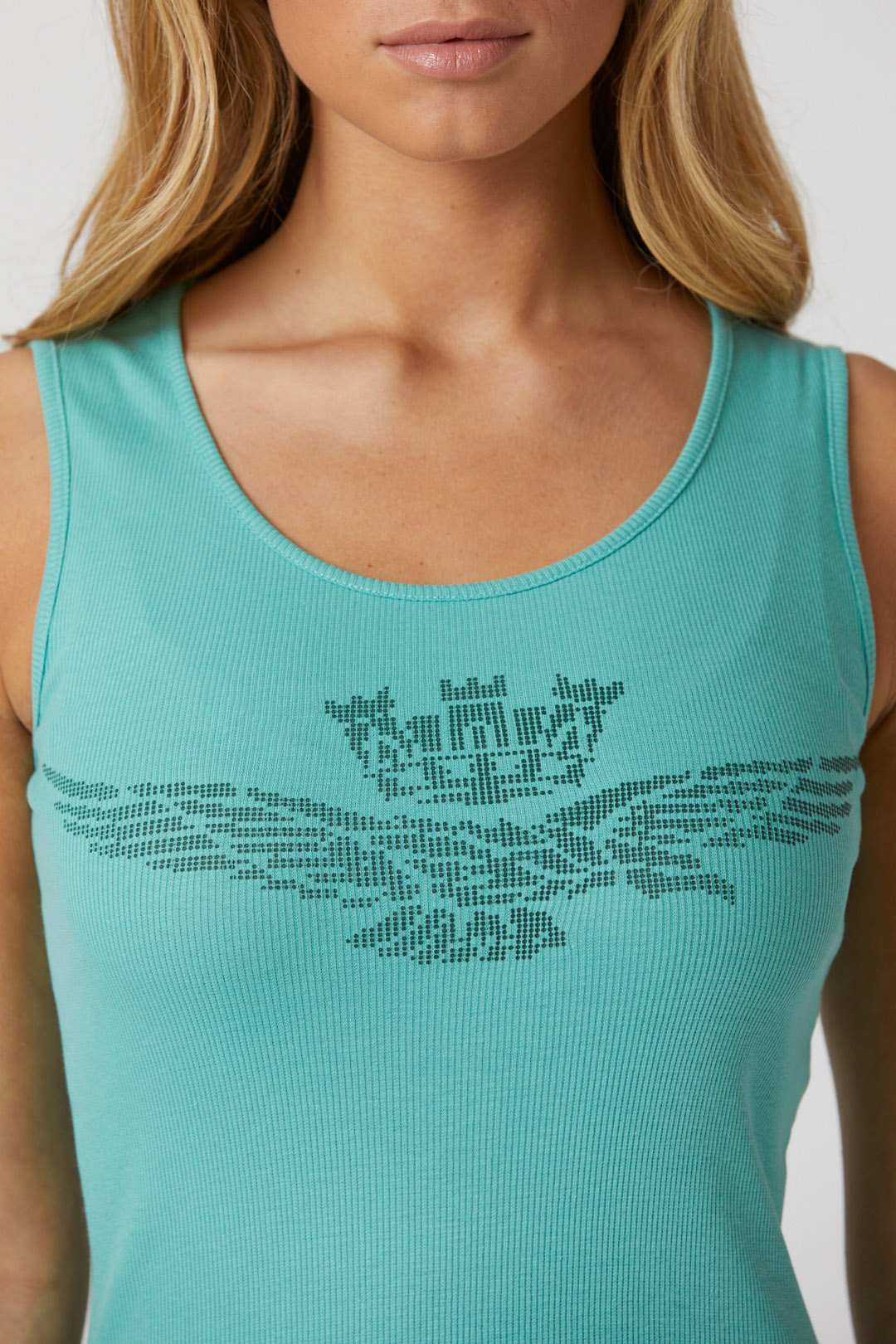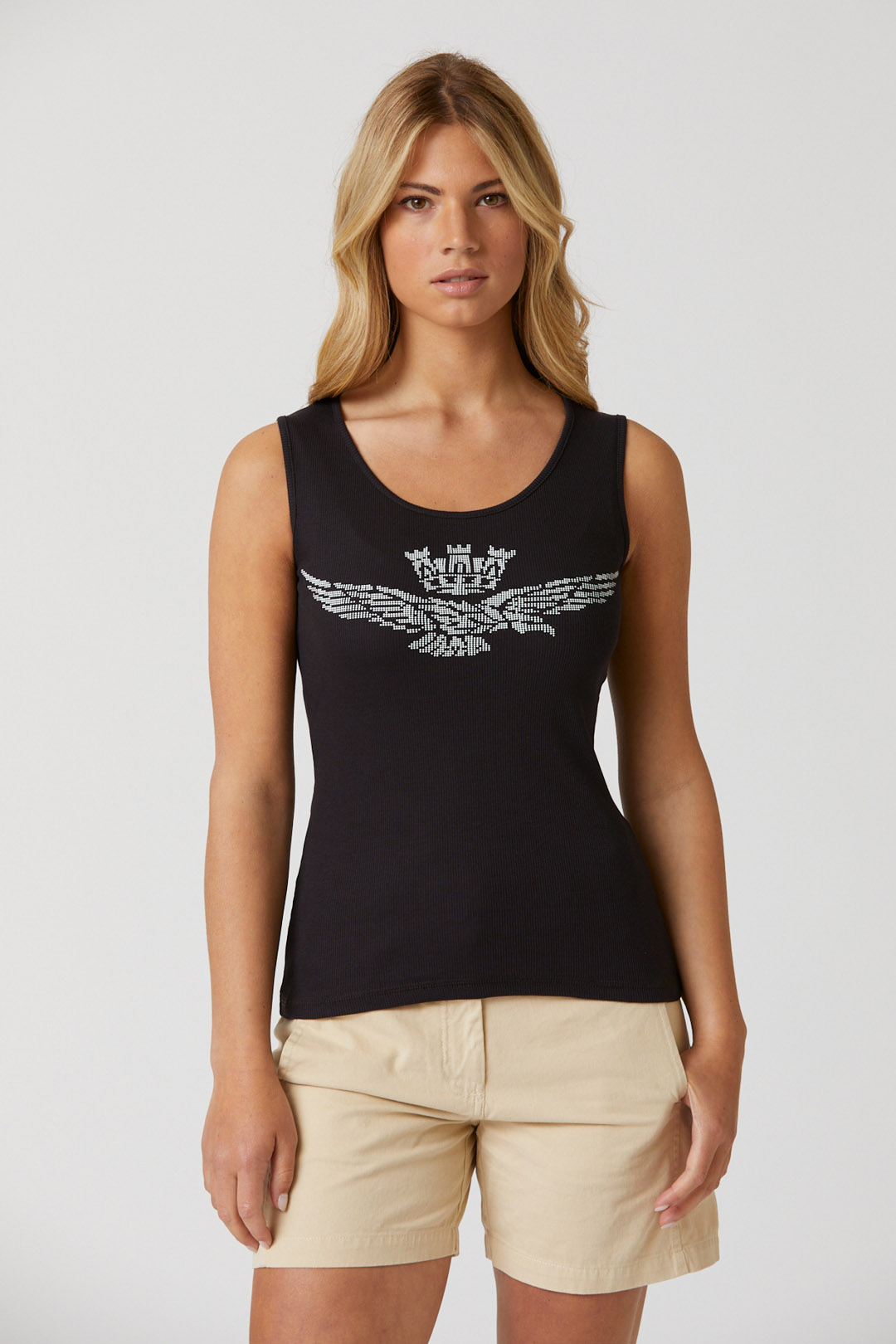 Toto pohodlné strečové bavlněné tílko s potiskem orla s věžičkou, dostupné v jasných a živých barvách, je základním oděvem, který nesmí chybět v žádném letním šatníku.