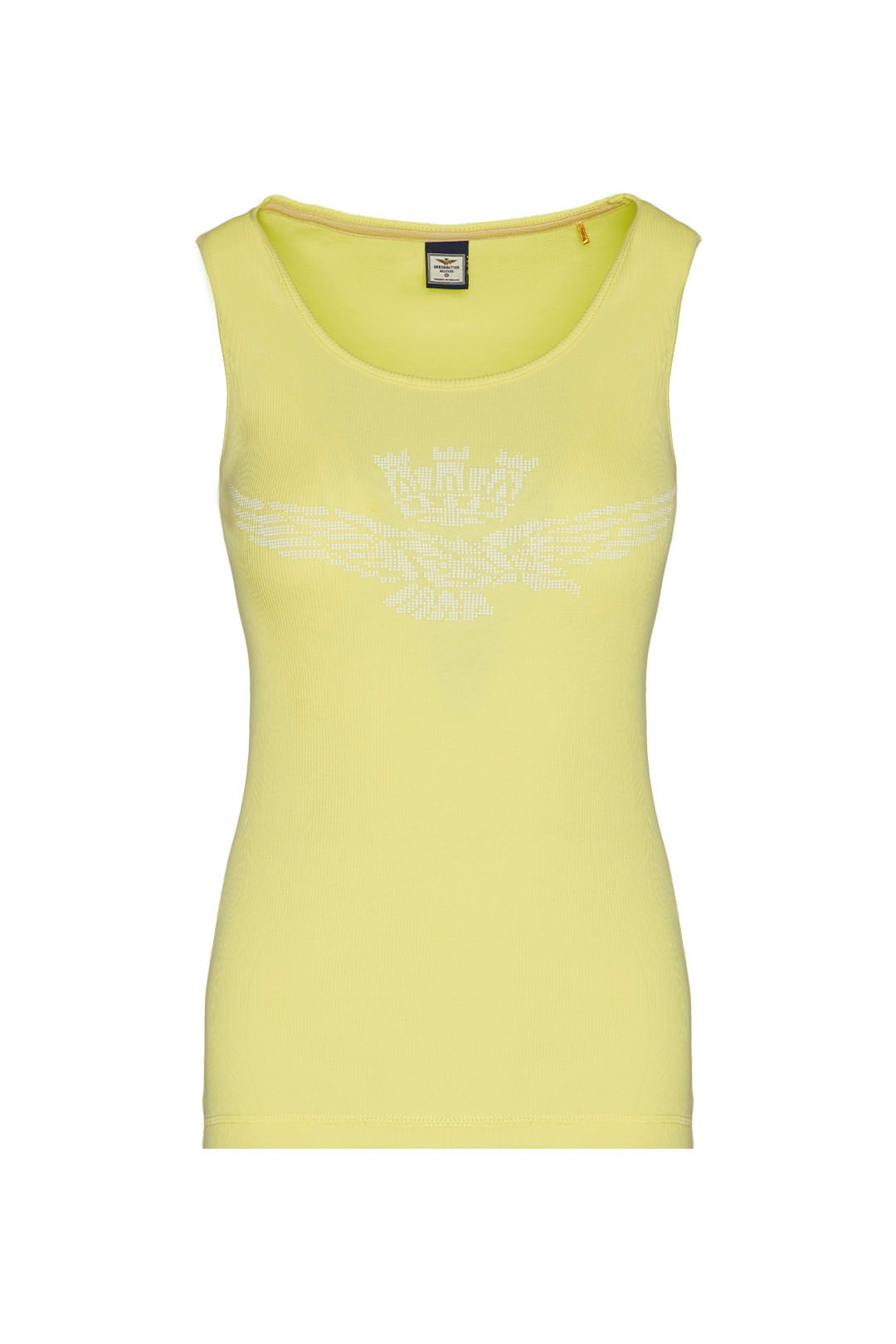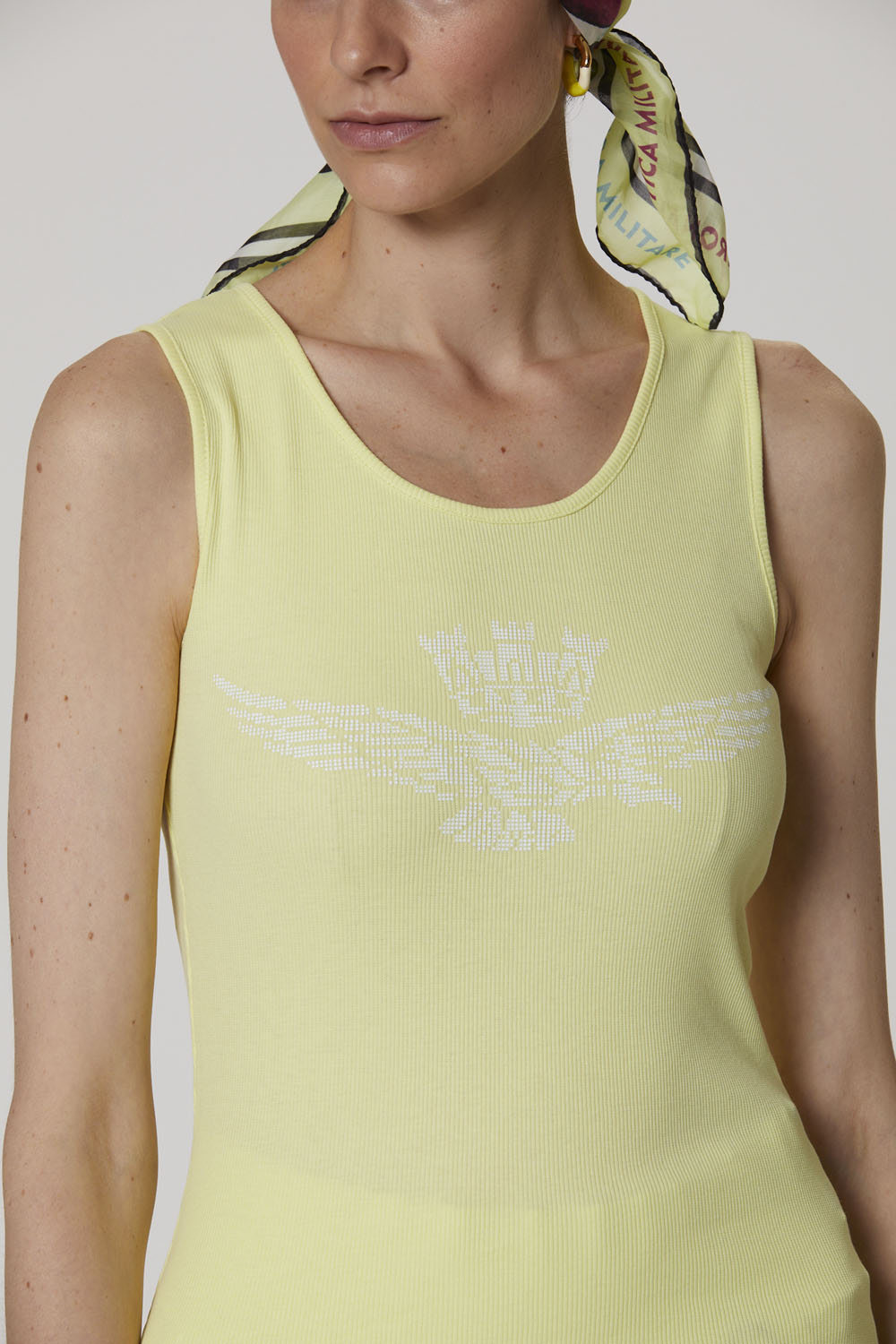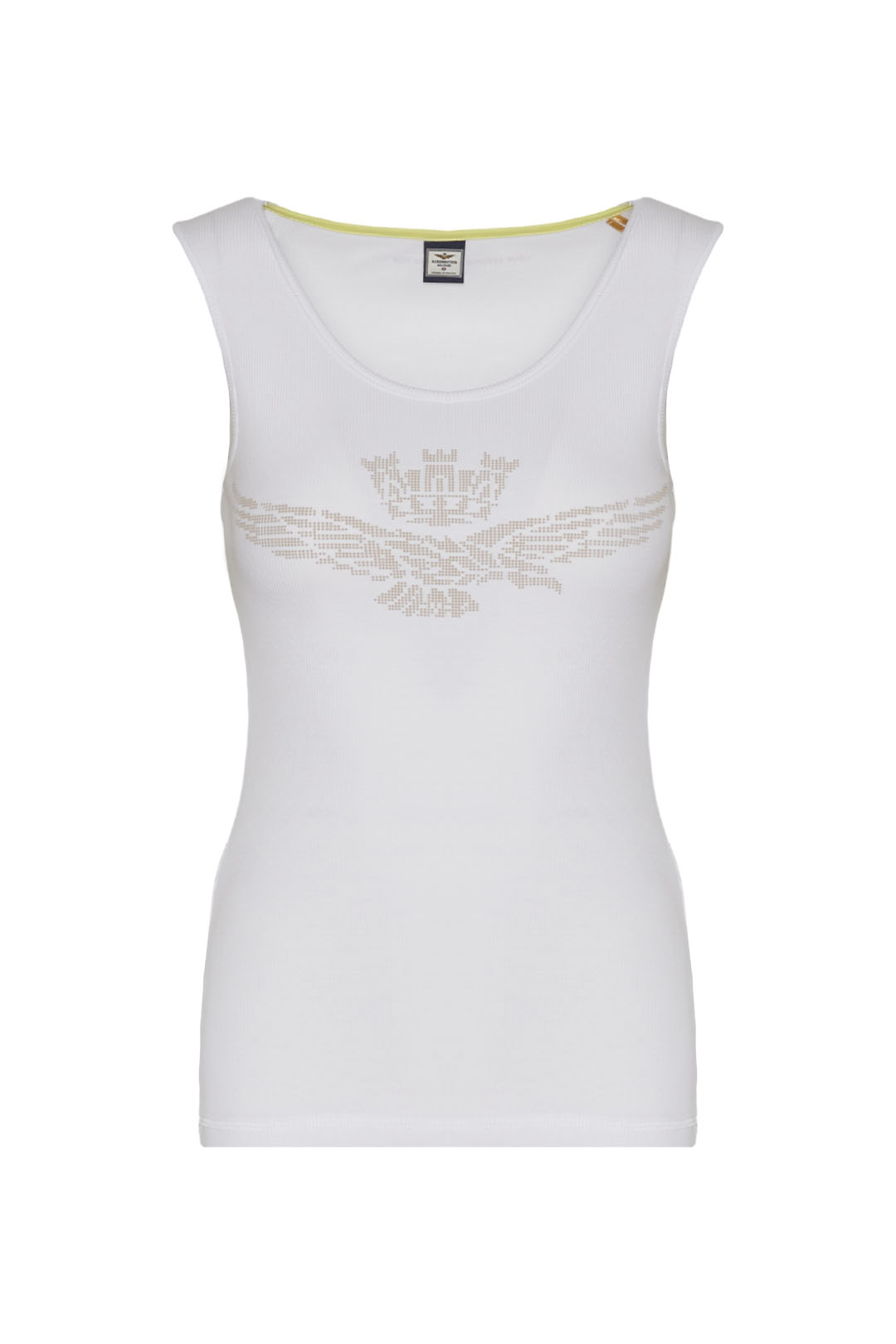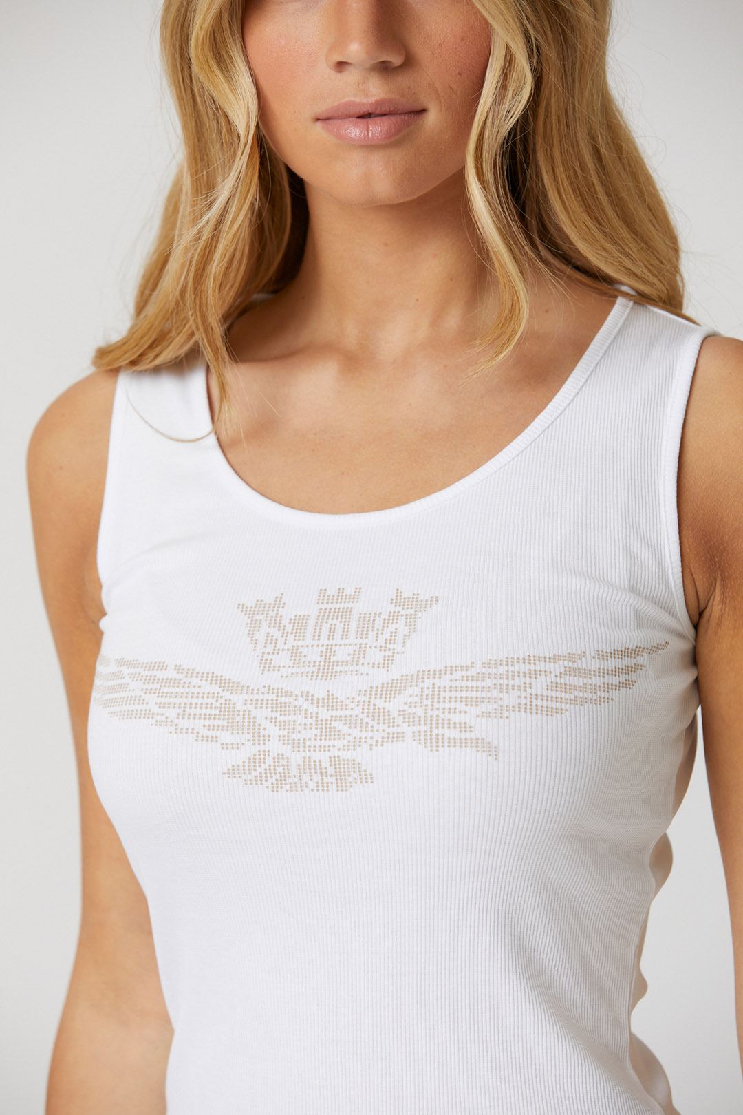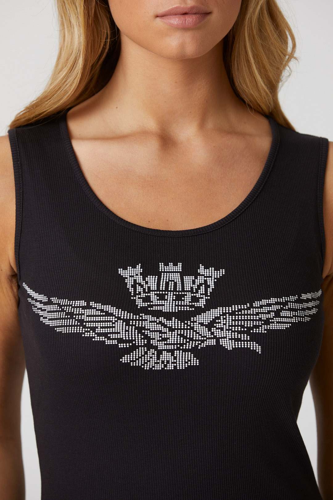 Toto pohodlné strečové bavlněné tílko s potiskem orla s věžičkou, dostupné v jasných a živých barvách, je základním oděvem, který nesmí chybět v žádném letním šatníku.