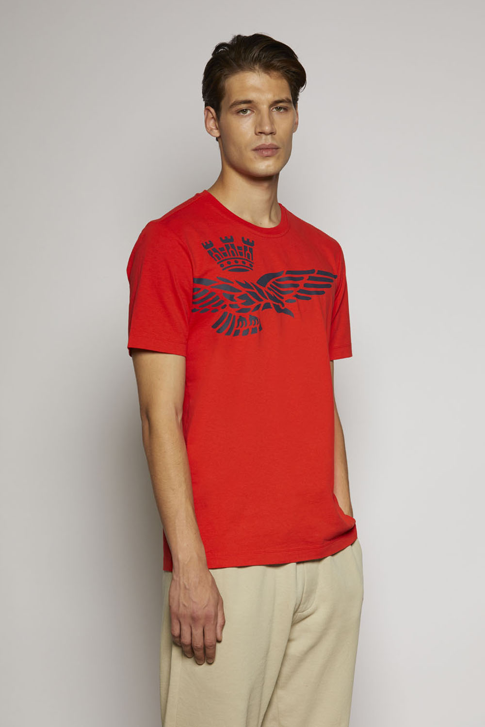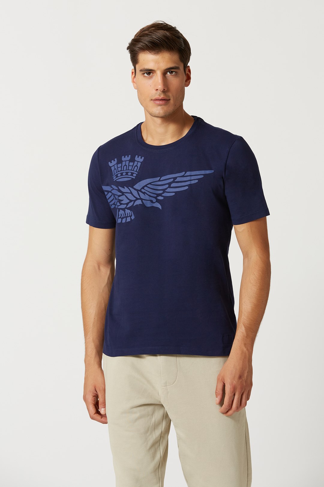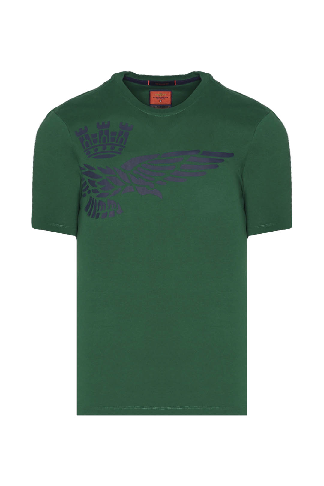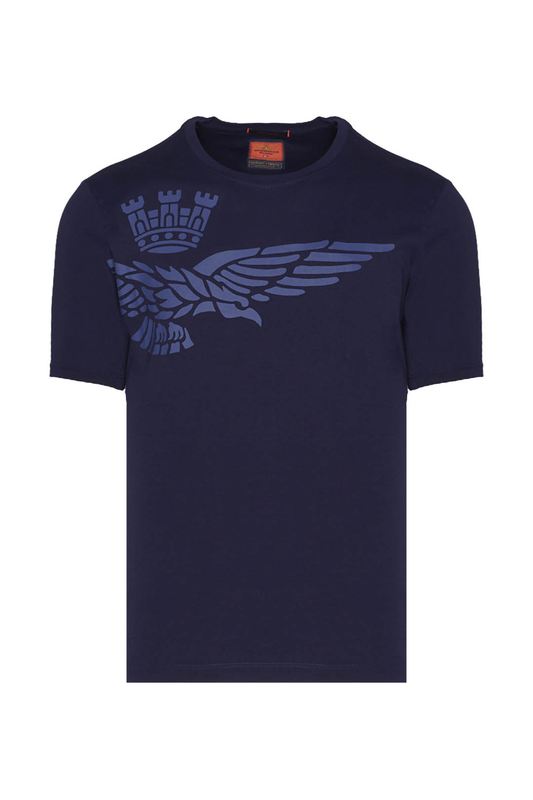 Špičkový oděv, který rozhodně vynikne. Toto tričko s krátkým rukávem, vyrobené z kompaktní žerzejové bavlny, se vyznačuje originálním polobočním potiskem slavného orla s věží, symbolu pilotů italského letectva.