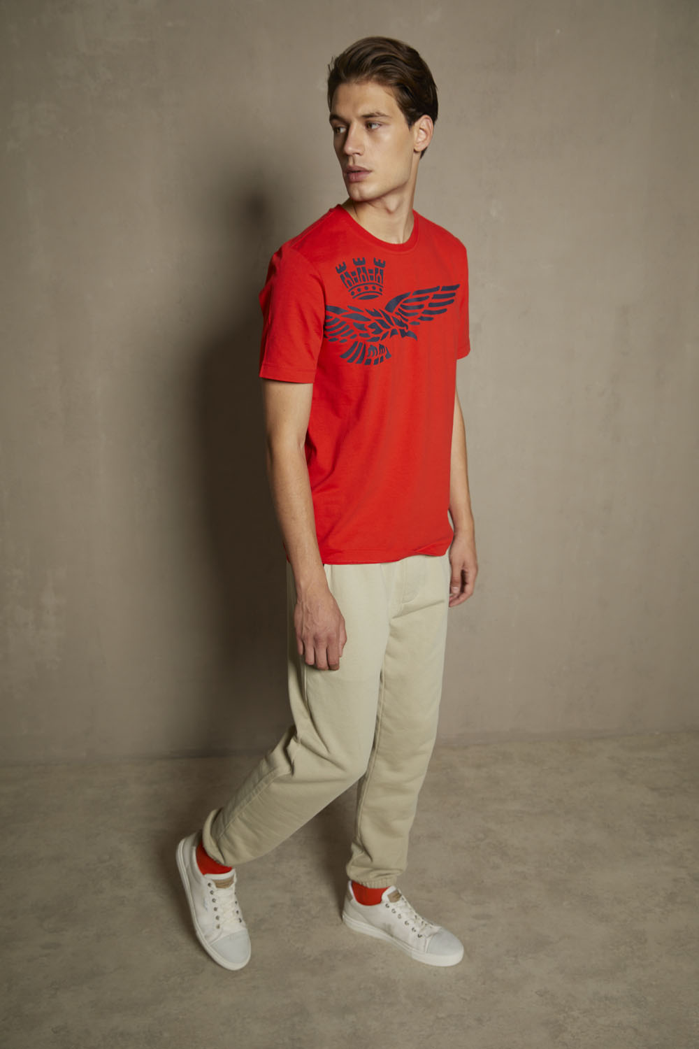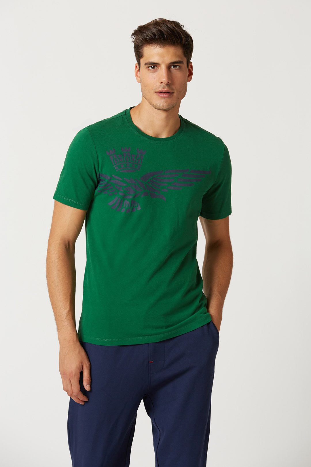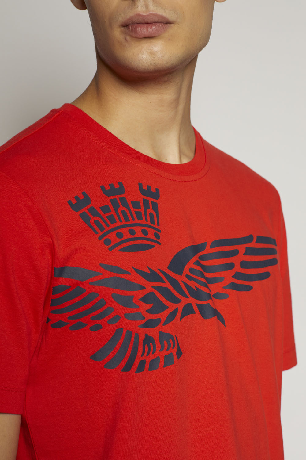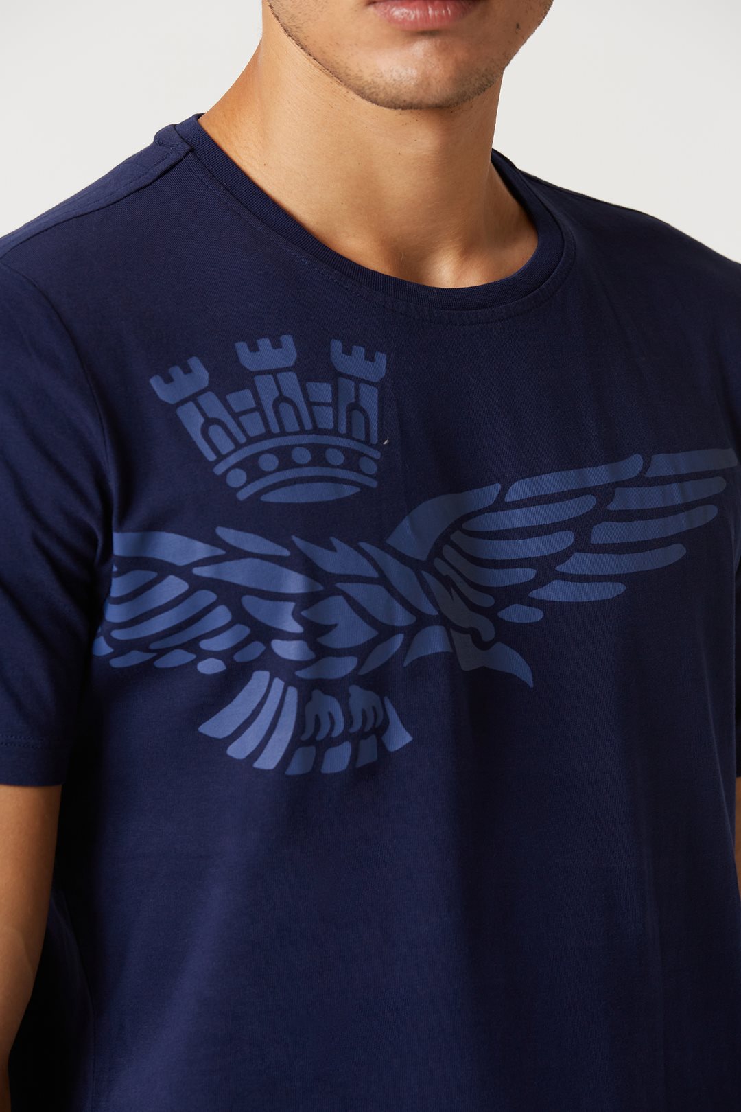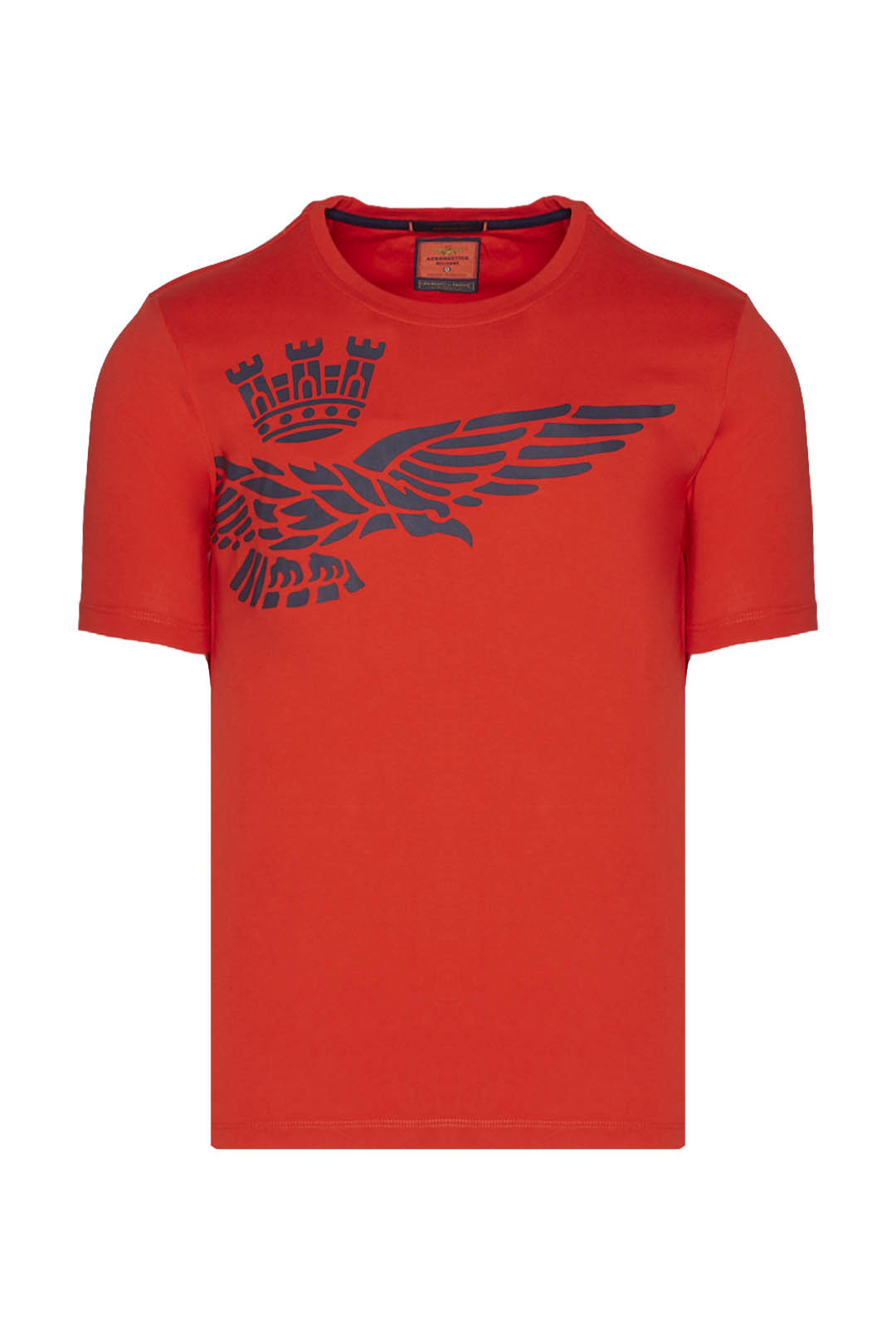 Špičkový oděv, který rozhodně vynikne. Toto tričko s krátkým rukávem, vyrobené z kompaktní žerzejové bavlny, se vyznačuje originálním polobočním potiskem slavného orla s věží, symbolu pilotů italského letectva.